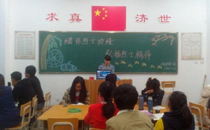 为贯彻党的十八大精神和习近平总书记讲话精神,对广大青少年进行爱国主义教育,2014年10月26日晚8时,12级护理1班全体同学在新校区护理大楼202教室开展了以“缅怀烈士功绩,弘扬烈士精神”为主题的团日活动。班会由团支书任倩文主持,辅导员王宇飞老师观摩。