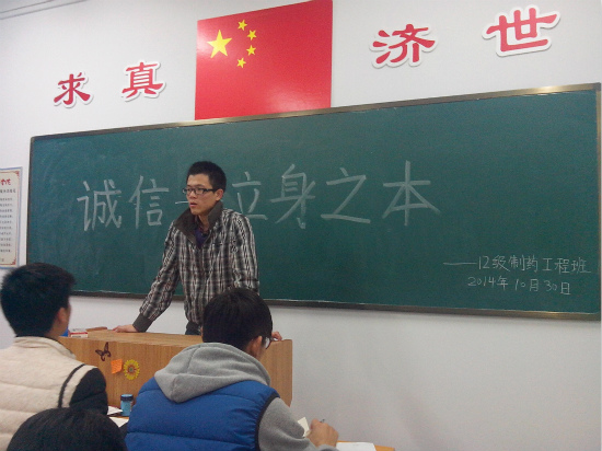 2014年10月30日,12级制药工程班在团支书谢飞的主持下开展了本次以诚信为主题的特色班会。通过本次活动,使同学们了解诚信的意义与价值,树立诚信意识;使同学们懂得“诚信,乃立身之本”的道理,学会在现实生活中如何讲诚信。