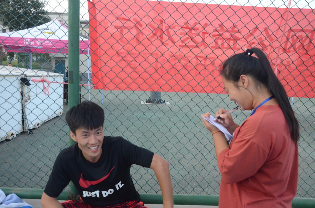 在球场上刚刚挥洒完汗水的程老师欣然接受采访。