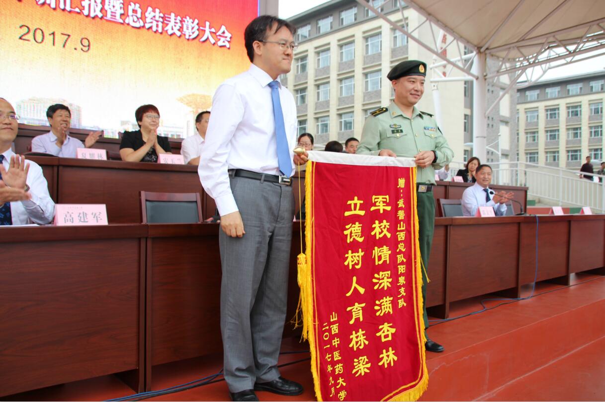 9月15日上午9时整,我校2017级新生军训汇报表演在杏林体育场隆重举行,同时对优秀军训班集体及个人进行表彰。出席本次大会的有党委书记段志光教授;副党委书记冯海教授;党委副书记高建军教授;党委委员、纪委书记郭文平教授;党委委员、副校长冀来喜教授;党委委员、副校长郝慧琴教授;山西省武警总队阳泉支队政治处副主任亢青。出席本次大会的还有各军训教官及各班辅导员。本次大会由党委委员、副校长王新塘主持。