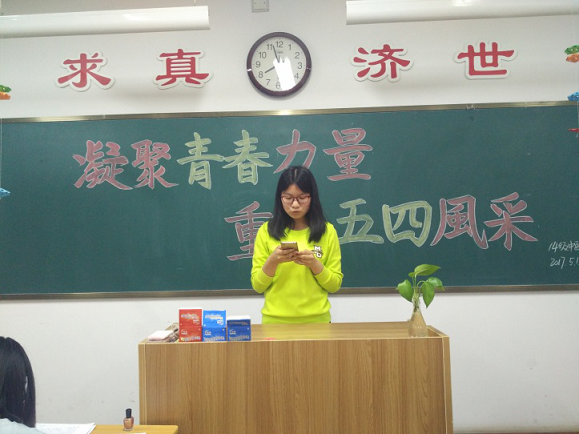 本次活动由团支书吴滢滢主持,以诵读会形式进行。首先,吴滢滢同学为大家重温了五四爱国运动的光辉历史,讲述了五四爱国运动的历史背景,起因,经过,结果以及历史意义。接下来各团小组分别派代表发言,朗读事先准备的五四爱国运动代表人物的文章,最后,团支书对本次活动进行总结:正是一批批爱国青年、仁人志士在五四精神的激励下前仆后继、舍生取义,最终才有了我们今天的岁月静好,我是90后,一名现代青年,在学校用成绩竞争,在社会用工资竞争,仍不忘初心、砥砺前行。