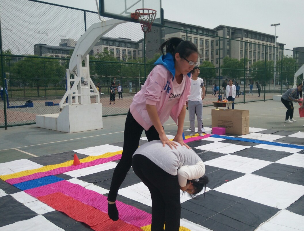 第二阶段“你追我赶”,共有五个任务,需要在环形指压板上进行筷子夹乒乓球、夹气球过障碍、交替山羊跳、背两名队友过指压板,最后一个任务则是在中间场地做出规定的姿势。这一环节,各个队伍齐心协力,在游戏的过程中获得了忠实感和亲密感,克服了孤独感。虽然许多队伍都在夹乒乓球环节耗费了很长时间,但是大家都沉着冷静相互鼓励。尤其在最后一个任务中,大家充分发挥想象力完美地完成了各个规定动作。最后,在这两环节用时最短的六支队伍晋级决赛。