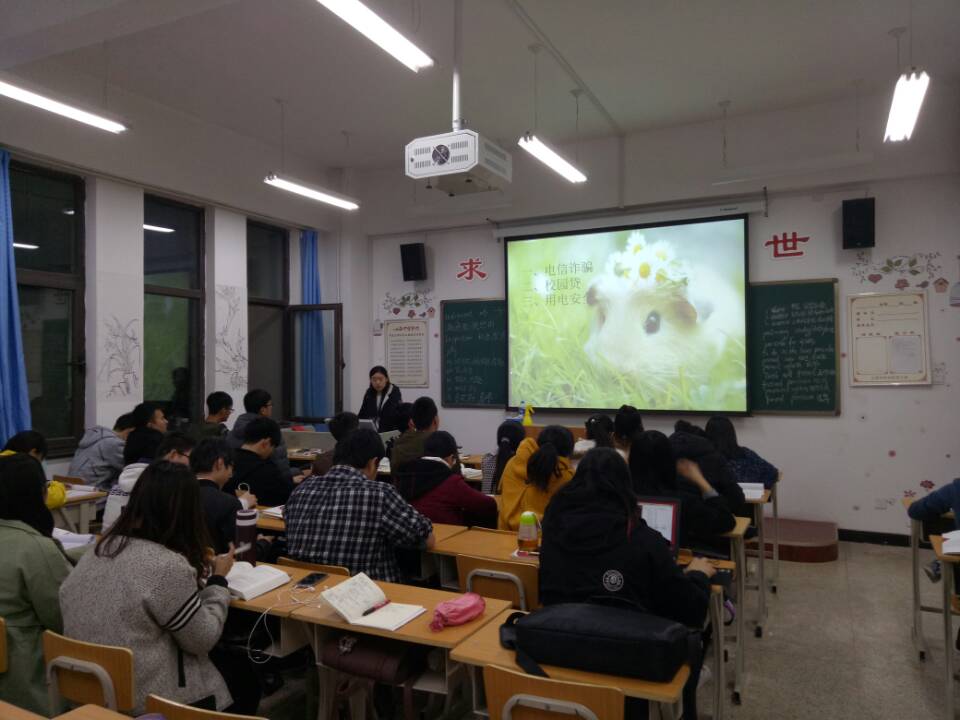 班会伊始,班长黄慧运用PPT向大家展示了本次班会的三项内容:电信诈骗、校园贷和消防安全教育。随后针对电信诈骗最新九大骗局进行了分析,并提出了解决办法;针对校园贷向大家进行了讲解,提醒大家要理性消费,远离校园贷;然后又从生活中的事例引出如何在寝室安全用电等等。最后,通过几个简短的视频,以真实的事例让大家了解到怎样正确应对生活中的各种安全问题。