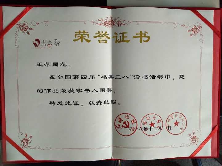 2016年12月人文学院办公室主任王萍老师在全国第四界“书香三八”活动中荣获家书入围奖,并获得荣誉证书。