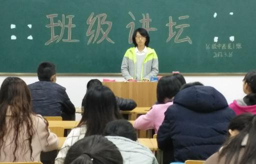 首先,主持人朗读了《面朝大海,春暖花开》一诗,拉开了本次班级讲坛的序幕;紧接着,潘红丹同学为大家讲述了当代诗人海子的一生,从情感与文学两方面,最后海子以诗人极端而决裂的方式走向了他的天堂,充满了浪漫与传奇色彩;然后,普良倩同学在播放了一段音乐后,为同学们介绍了音乐治疗的含义、起源、机理、方法,并为大家介绍了各种方面的音乐治疗曲目;两位同学演讲完后,主持人带领大家进行了几场小游戏,活跃了班级氛围;最后,由秦婧媛同学以一些各国关于读书的数据拉开了她的演讲:《你手中的书暴露了你的社会地位》,为同学们展示了目前中国学生读书的现状,并鼓励大家多读书,读好书。