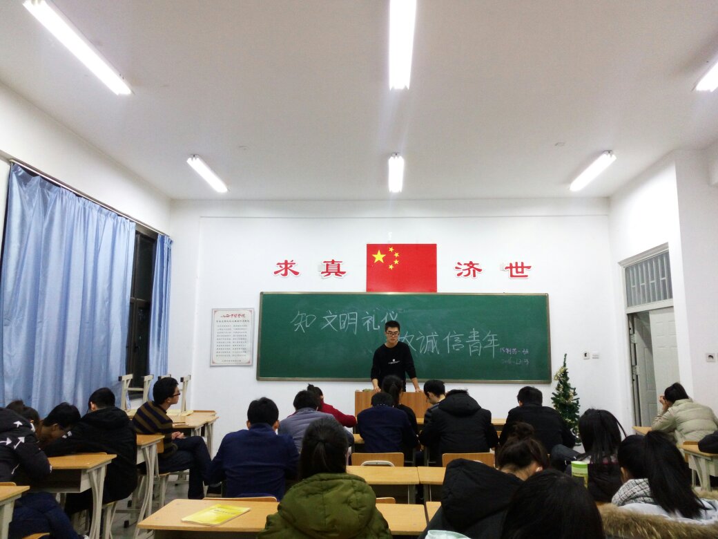 15级制药工程一班于2016年12月23日在仁爱书院408教室举办以“知文明礼仪,做诚信青年”为主题的团日活动,引导学生树立诚信意识,遵守诚信规范,端正诚信行为,促进学校诚信之风的建设。由团支部主持这次活动,全班同学积极配合。