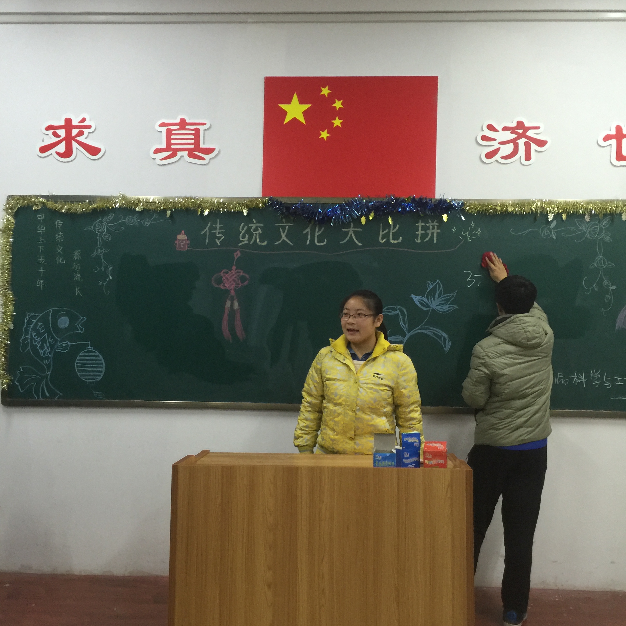 冬至,是中国农历中一个重要的节气,也是中华民族的一个传统节日,冬至俗称“冬节”、“长至节”、“亚岁”等。在中国北方有冬至吃饺子的风俗。俗话说:“冬至到,吃水饺。”而南方则是吃汤圆,当然也有例外,如在山东滕州等地冬至习惯叫做数九,流行过数九当天喝羊肉汤的习俗,寓意驱除寒冷之意。为了让同学们进一步了解中国的传统节日,发扬传统节日文化,也为了借冬至这个温馨的节日让大家感受集体的温暖,2016年12月21日晚7点30分,制药与食品工程学院14级食品科学与工程1班在和剂书院207教室举办了以“温暖年华”为主题的班级心理活动,全体同学都积极参与到此次活动中。本次活动包括冬至及中国传统节日文化知识竞赛,汉舞欣赏,真情表白之我们是一家人三部分组成。