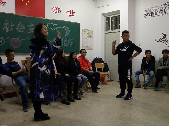 活动开始,主持人首先邀请几位同学对社会主义核心价值观进行阐述,并发表各自的看法,而回答不出相关内容的同学则需要接受一系列有趣的惩罚。而后,主持人为了考验班级同学的团队的合作能力,将所有成员分组,进行“同舟共济”的游戏。游戏规则要求各组成员需要在各自所分得的指压板上集体站稳,然后,主持人依据团队稳定时间的长短来评判各组成功的程度。在整个活动过程中,同学们积极参与,气氛活跃。活动最后,虎应劼同学总结到,社会主义核心价值观涉及到日常生活的方方面面,作为当代大学生,在提升自己符合时代发展潮流的同时,团结友爱方面的培养同样不可忽视。