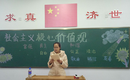 活动在主持人刘坤介绍社会主义核心价值观的基本内涵中拉开帷幕,同学们对社会主义核心价值观有了初步理解。接着,张超为代表的团小组进行大合唱,慷慨激昂的歌声使现场气氛达到高潮。其次,刘志芳、韩杰等同学朗诵《社会主义核心价值观——中国梦》鼓励大家自觉践行社会主义核心价值观。然后,107宿舍成员上演精彩方言版三句半,使同学们在欢乐祥和的氛围中对社会主义核心价值观有了更深的理解。最后,张雅芝同学组织大家进行了欢快的游戏,将现场气氛推到了顶点。活动结束时刘坤同学做总结 ,呼吁大家将社会主义核心价值观传承下去。