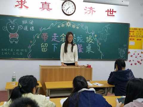 2016年11月17日晚7点30分,16级中医一班全体同学在医学楼312教室举办了 “带走余餐垃圾,留下卫生餐桌”的主题班会,由生活委员王兆南同学担任本次班会的主持人。