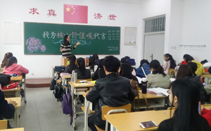接着,刘萍让同学们对社会主义核心价值观的认识发表自己的看法。王敏、王蕾等同学积极发表自己的看法,并且讲了相关的小故事,深入浅出的对价值观其中的爱国、公正进行了阐释。