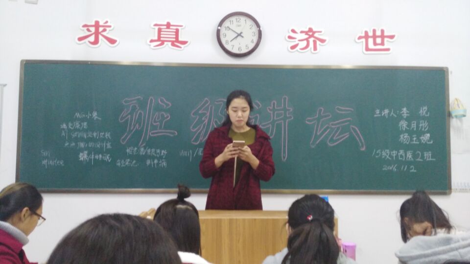 11月2日晚,15级中西医2班举办班级讲坛,由李月,杨玉婉,徐月彤三位同学演讲,15级中西医2班全体同学参加。