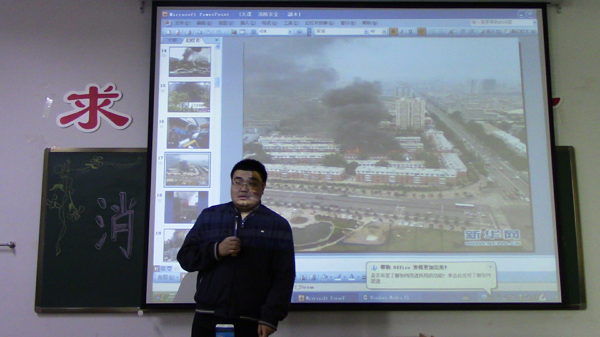 甘霖老师首先向同学们播放了当时震惊全国的小悦悦事件监控视频,生动形象地告诉同学要学会自救。接着甘霖老师告诉同学们烟气是火灾中的第一杀手,向同学们介绍了几种常用的灭火方法,灭火器的种类,功能以及保存方法,结合自身的亲生经历告诉同学们因灭火器保存不当而造成的严重后果。接着一幅幅触目惊心的图片,一段段发人深省的视频,生动地讲解了消防安全知识。同学们不时传来的惊异之声,表现了对讲座内容的重视。最后,各宿舍长为代表领取学院发放的安全桶,以备日后的不时之需。