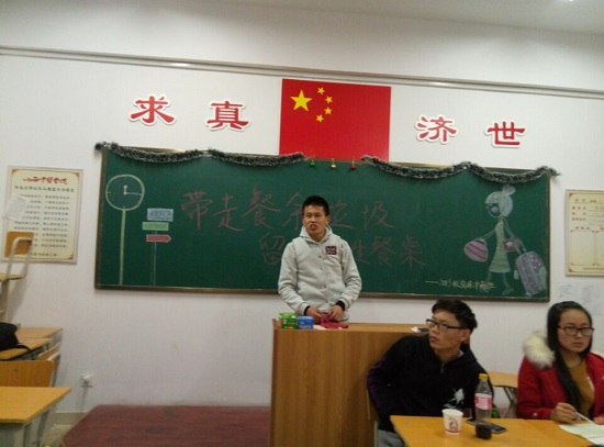 作为一所真正文明的大学,它的文明包括诸多方面,其中,餐饮文化就是一个很重要的内容。因此,文明就餐,从你我做起,从身边的点滴小事做起。为让同学们能够了解且知道文明就餐的意义,2015级临床中药班特于11月16日晚8:30时在和剂书院甲座212教室举办“带走餐余垃圾,留下卫生餐桌”班级活动,此次活动由班长王小伟主持,2015级临床中药班全体学生悉数出席。