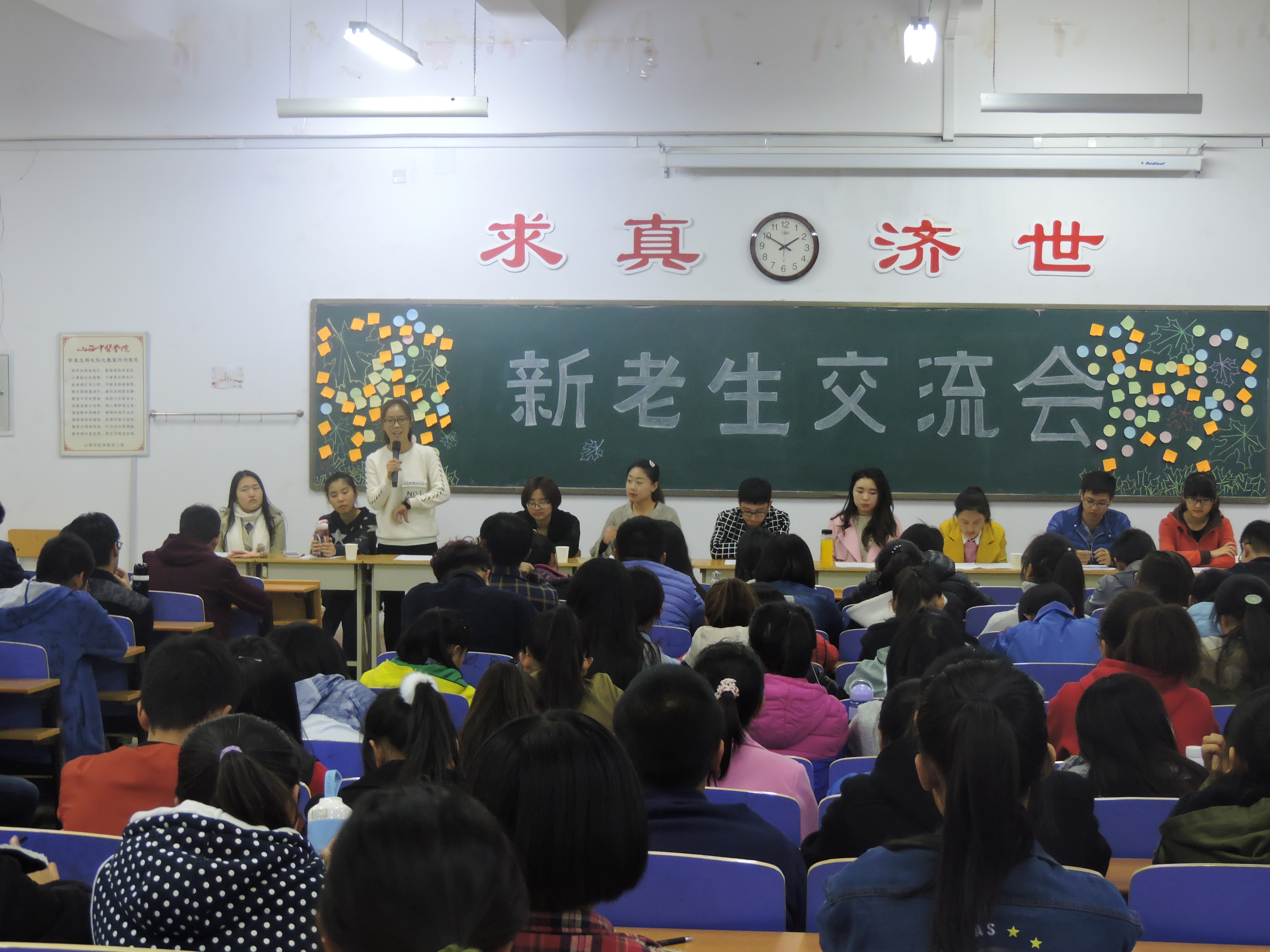 大会在主持人幽默风趣的话语中拉开了序幕,首先向同学们介绍了各位品学兼优、荣获各种奖项的14、15级的同学们,随后他们与大家分享了关于大学生活、学习、社团工作、就业问题等的相关经验,并且对16级新生提出的问题一一作出解答。接着谈到了如何处理大学生活中问题、如何处理好人际关系、如何更好更快的从高中的学习模式中转变到大学学习模式中,并且给出自己的经验和建议。