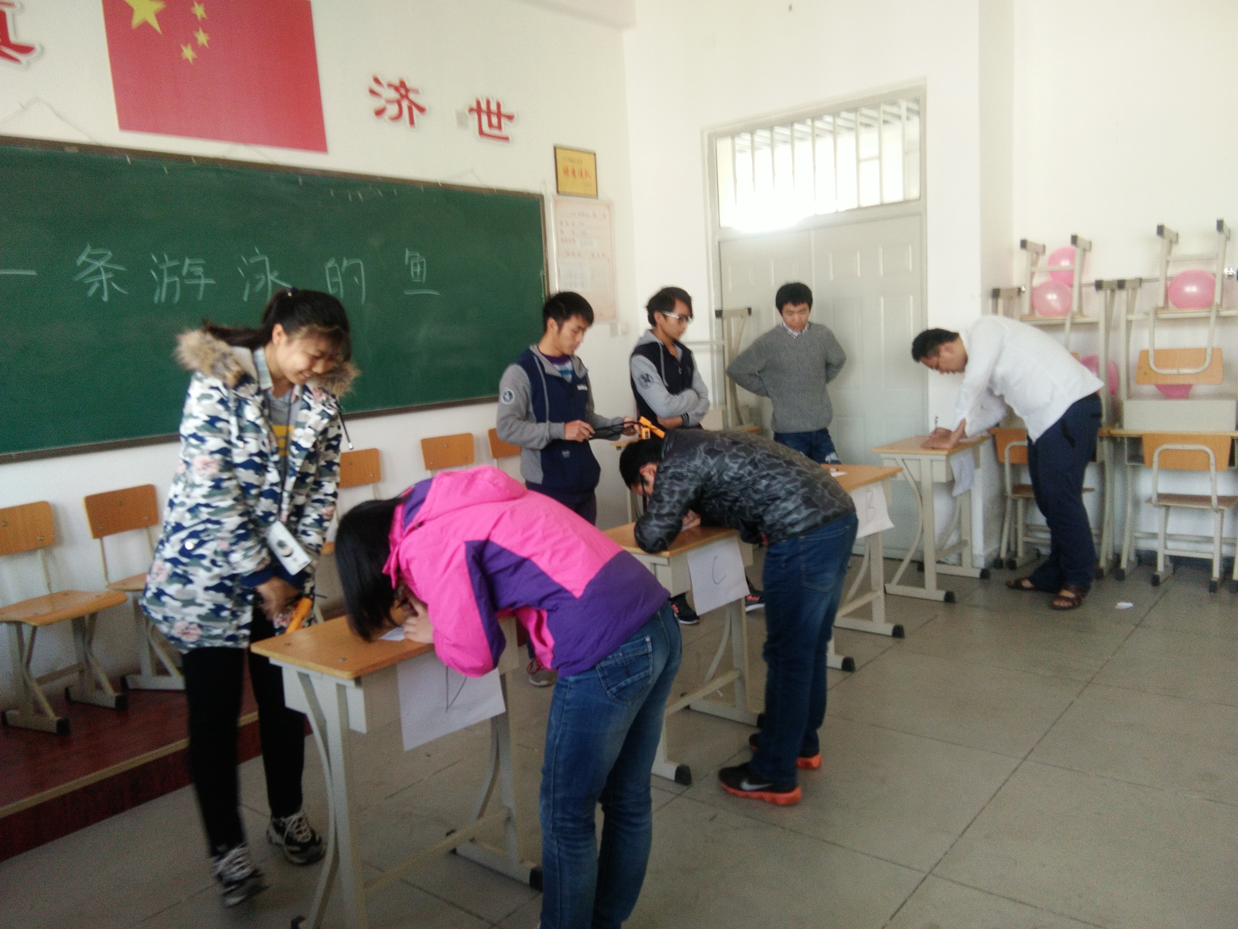 候场区人声鼎沸,所有参赛者都在积极准备相关词汇。本次比赛主题为“密室逃亡”,各密室活动内容可谓精彩绝伦,题目生动有趣。各队员紧密配合,首先由队员通过密室中黑板上的密语进入下一密室进行压气球、双人跳绳、下腰过杆等游戏,同时又由另一位队员进行答题。随着时间飞逝,参赛者脑筋飞快转动,尽自己最大的努力把脑海中存储的汉字写下。这是一场脑力与速度的角逐,同学们迅速并有条不紊地进行着。美好时光总是那么短暂,不知不觉,比赛已接近尾声,参赛选手陆陆续续离开比赛场地,初赛取得圆满成功。