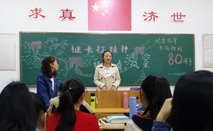首先,解佩佩同学介绍长征的基本情况,让同学们在回顾长征的艰辛历程的同时感悟伟大的精神。随后,团小组进行讨论,付小雪、刘英杰等代表讲述长征精神对我们社会发展自我养成的重要作用。姚南、周光敏、史文榕则分享了长征中的故事,带给同学们许多感动。紧接着,马亚楠同学朗诵《七律.长征》、《江城子.忆长征》并且播放了《十送红军》、《长征》等歌曲,增强活动氛围,促进同学们对长征精神内涵的感悟。最后,解佩佩进行活动总结:长征精神就是要坚定革命的理想和信念,坚信正义事业必然胜利的精神,为了救国救民、不怕任何艰难险阻,不惜付出一切牺牲的精神;就是坚持独立自主,实事求是,一切从实际出发的精神。我们要继承和发扬长征精神,展示我们的青春风采。