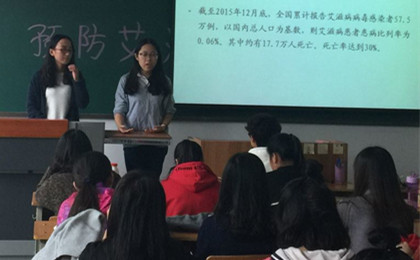 首先,王丽炜同学以PPT的形式让同学们了解到艾滋病的流行情况,并进行了相应的解说。接着由张金鑫、李婧、梁爽等同学讲述她们在实习过程中遇到的艾滋病案例,王丽炜同学由此切入主题带领大家共同学习艾滋病的相关知识和预防措施。然后,545、547宿舍同学出演以艾滋病为主题的诗歌朗诵,让同学们更加深刻的了解艾滋病。最后,谢红蕾同学带领大家合唱《你好,艾滋》的歌曲。歌词深入人心,与大家形成共鸣。最后,王丽炜同学做活动总结,本次活动圆满结束。
