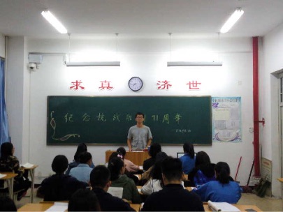 2016年9月27日晚,七点半,15级中医一班全体同学于医学楼201教室成功举办“纪念抗战七十一周年”主题班会。本次班会由团支书程浩航同学主持,导员黄朝忠全程参与。