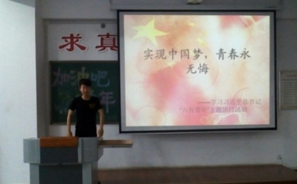 活动在全班同学歌唱《我的中国心》和《青春•理想》中拉开帷幕。紧接着,常田同学上台讲演《理想信念在我心》,让同学们充分了解到梦想对我们大学生成长成才的重要性;其次,由李昕楠、王俊等同学用一种无声的方式演绎了歌曲《明天,你好》,使同学们在他们抒情的手语中,感受到新一代青少年积极向上的精神面貌。在活动过程中朗朗上口的三句半《大学生好修养》,让全体同学更好地理解修养、认识修养,真正体会到修养对我们大学生的重要性。孙小卫等同学带来的小品《我没乱扔》带给大家无限幽默风趣,让大家在欢乐中反省自己平时的行为习惯,同时也让大家意识到增强大学生素质的必要性。活动期间,游戏“二人手”、“凤凰飞”使全体同学参与到本次活动中来,将全场气氛推向高潮。