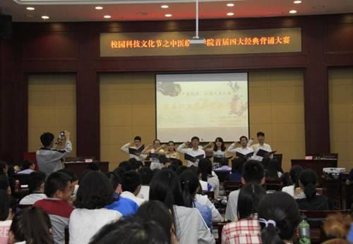 经过一个多月的筹备,对参赛选手进行了层层选拔,最后有12支队伍脱颖而出、进入决赛。比赛在悠扬曼妙的朗诵和刚柔并济的太极扇表演中拉开帷幕。主持人通过VCR为在场观众详细介绍各年级的参赛队伍。比赛过程中,各参赛选手对经典条文了如指掌,他们沉着镇定、密切配合、信心十足,赢得全场观众热烈的掌声。大赛在“秀出真我”环节进入白热化阶段。选手们对经典精彩的讲解以及对老师问题的回答,彰显出中医学子的沉稳大气,赢得了大家的一致好评。同时,现场观众在微博互动中,为支持的选手送出自己的祝福,为诵读大赛的明天表达自己的祝愿。