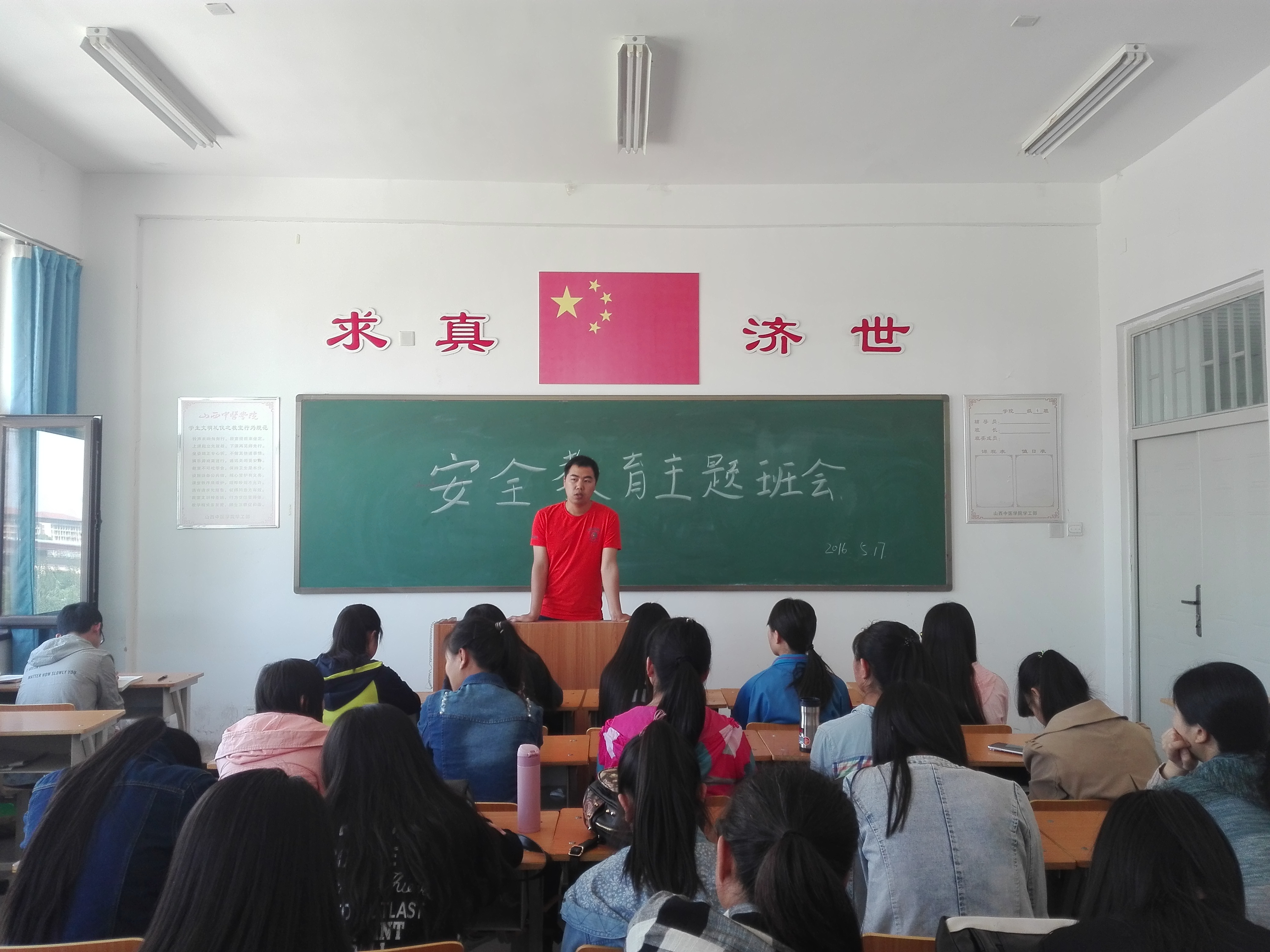 2016年5月17日星期二,15级制药工程四班与仁爱书院408教室召开了安全教育主题班会。会议由辅导员主持全体人员均参与了此次会议。