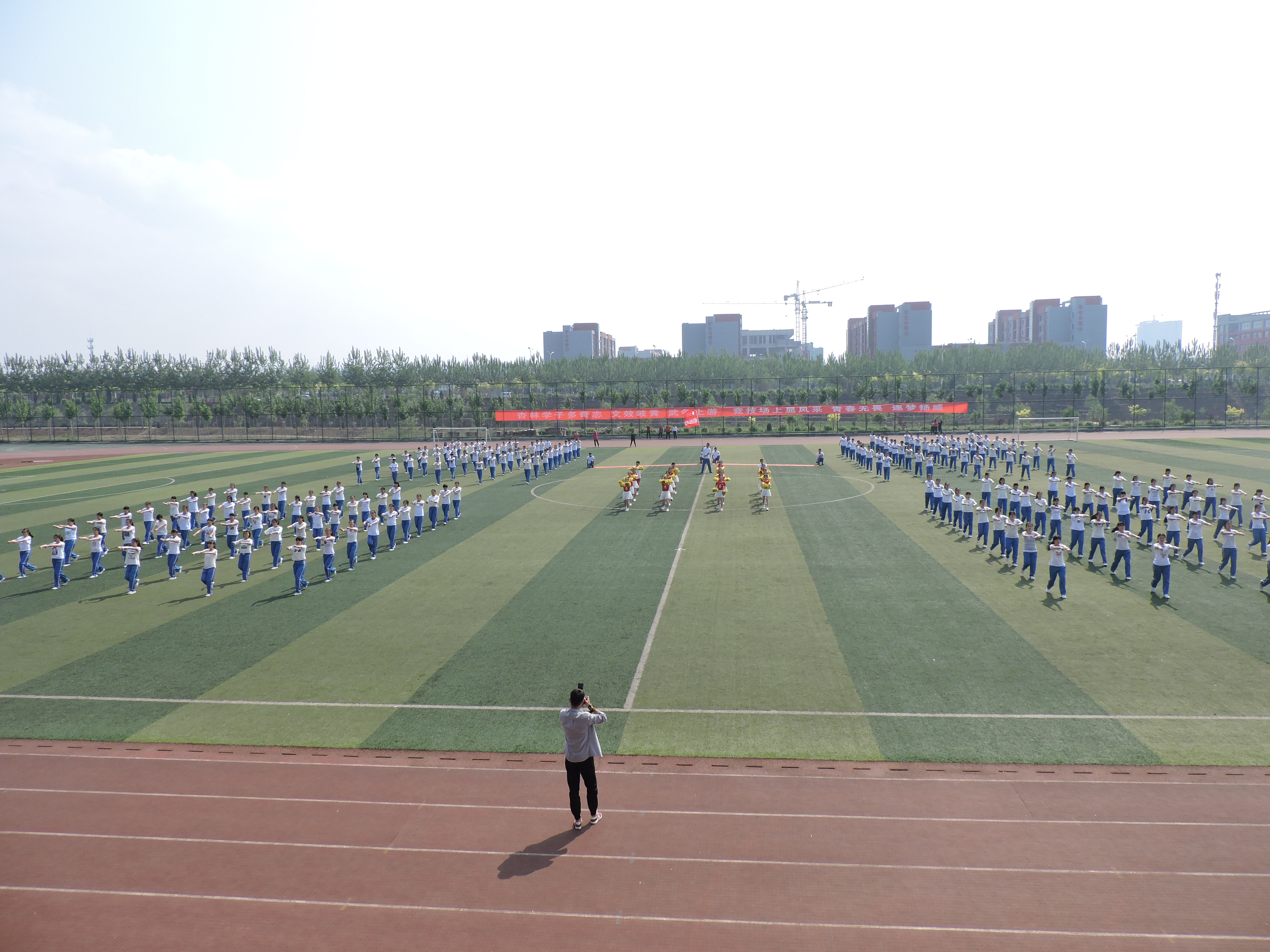随着运动会开幕曲,运动员们迈着整齐的步伐入场。我院运动员方队朝气蓬勃、青春洋溢,踏着整齐的步伐,喊着响亮的口号走过主席台前,接受领导们的检阅。紧接着,团体操表演开始,我院独具匠心的方阵设计和整齐划一的动作,让领导们赞不绝口。