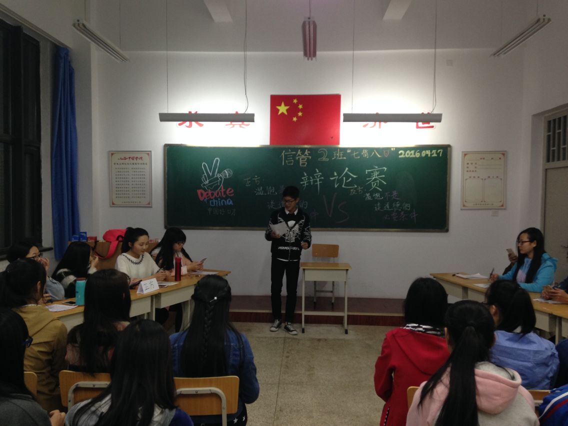 2016年4月24日19点30分,15级信管二班在管理楼115教室举行了友谊辩论赛。此次辩论赛由翁兴辉同学担任主席。由正方辩手组成的四大名嘴队和由反方辩手组成的最佳口才队通过辩题“温饱是不是道德的必要条件”展开激烈辩论。