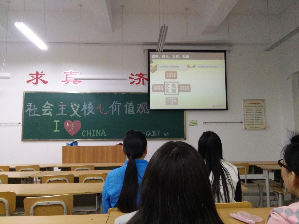 19点15分活动开始。首先由主持人向同学们介绍了对于社会主义核心价值观的相关内容。伴随着宣扬社会主义核心价值观的歌曲,“富强、民主、文明、和谐、自由、平等、公正、法制、爱国、敬业、诚信、友善”久久环绕在同学们的脑海。最后,一部关于社会主义核心价值观的短片,让同学们对它的具体由来以及内容都有了更深入透彻的了解。
