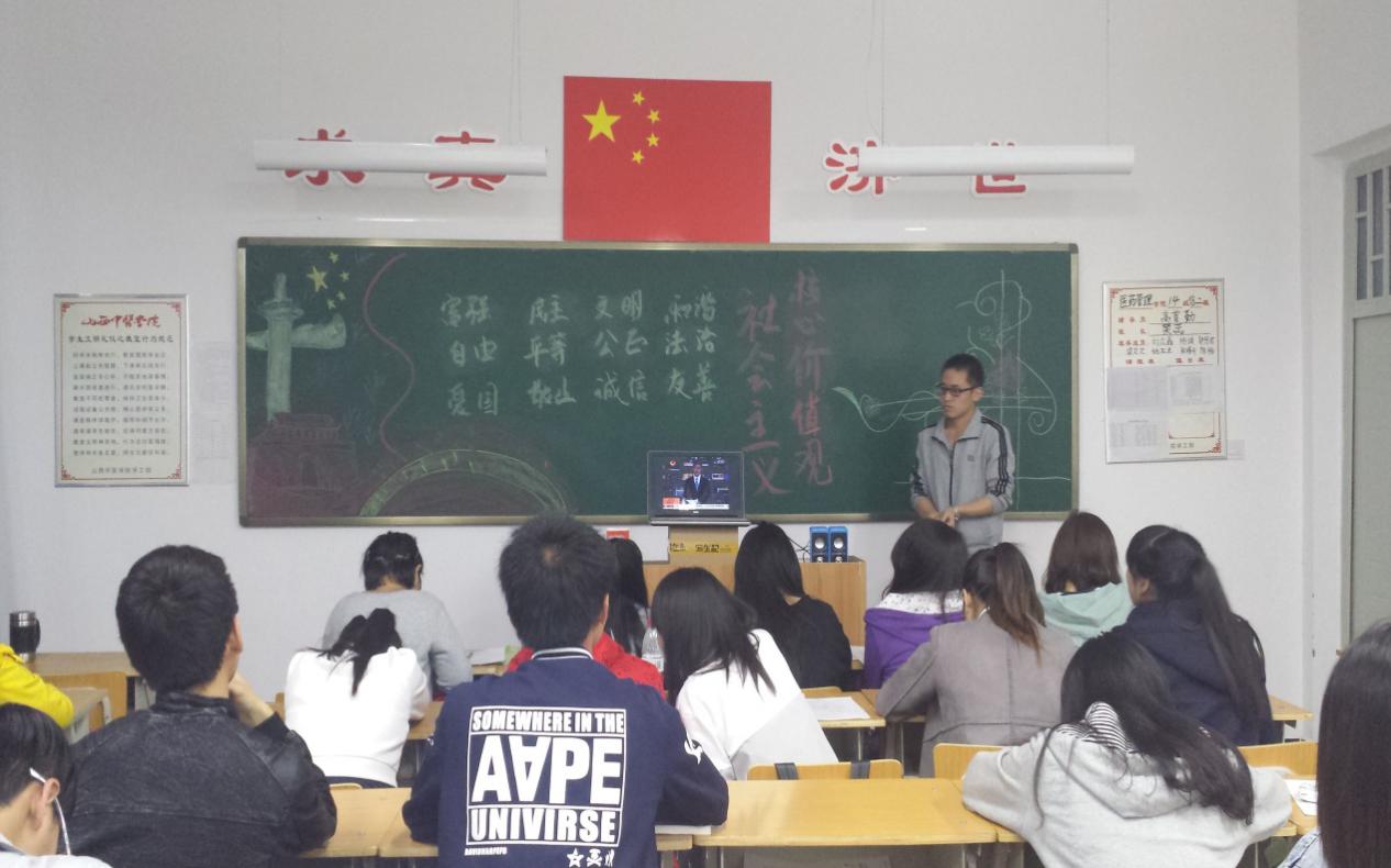 活动开始,由团支书刘立鑫放映两个视频,视频的内容是社会主义核心价值观与日常生活的小事之间的联系。而后将全班分成九个团小组,由小组长上台分享自己身边的关于社会主义核心价值观的真人真事。最后由团支书总结发言来结束本次活动。