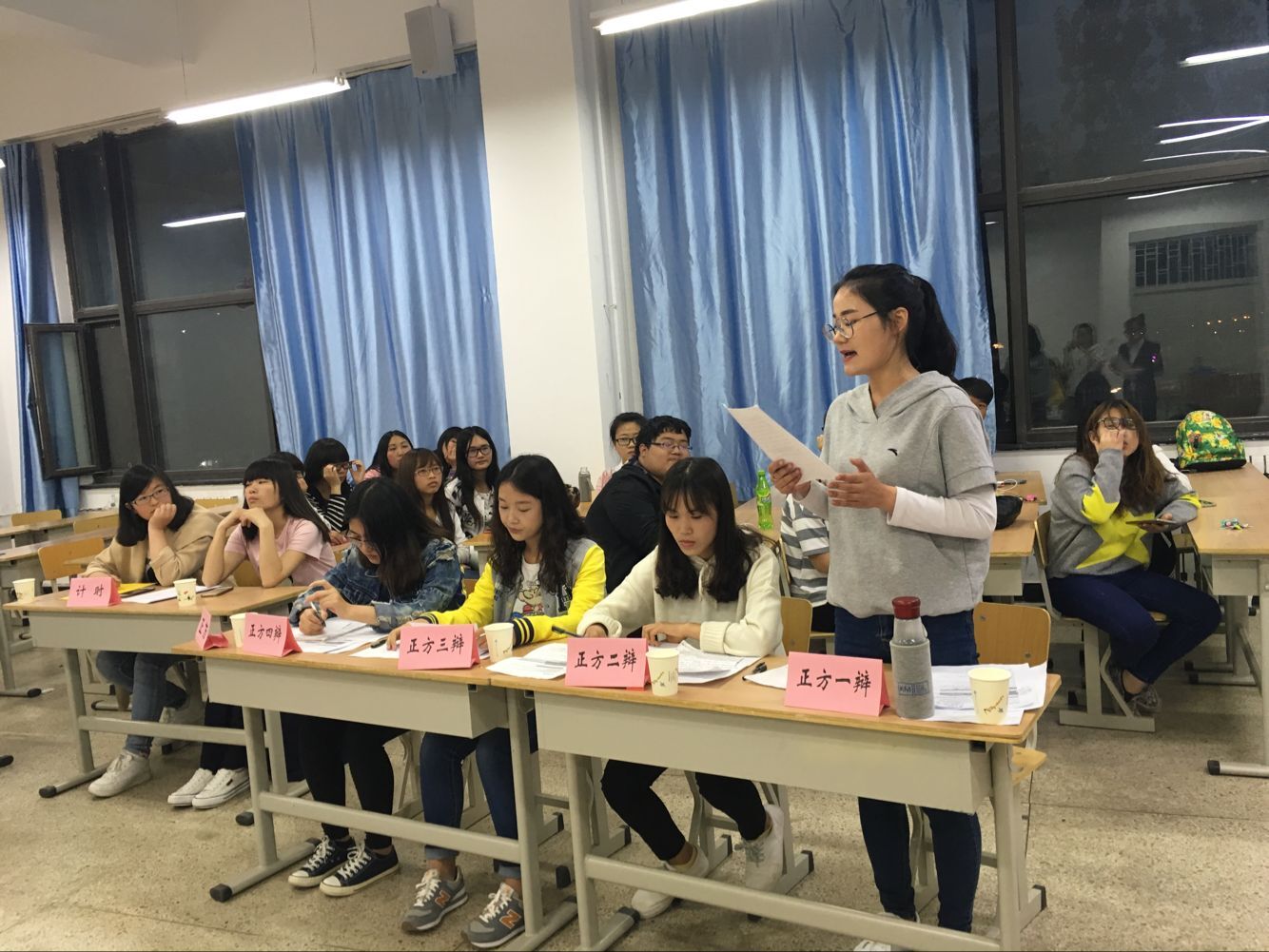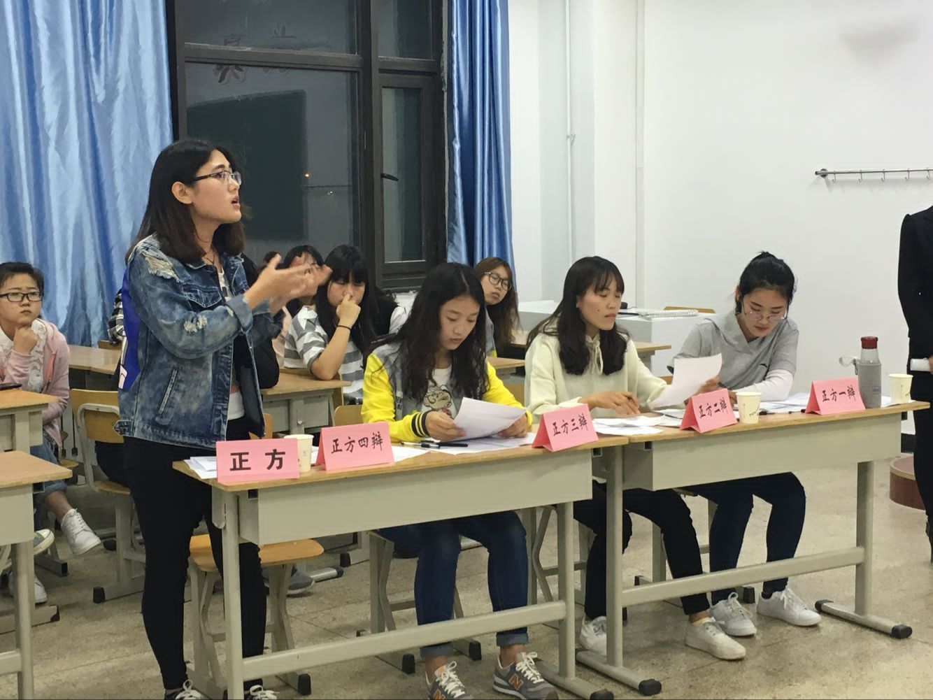 本次比赛分为管理楼117、118两个赛区,初赛脱颖而出的十个班级分别进行五场精彩的辩论赛。辩论赛分为开篇立论、攻辩、自由辩论与总结陈词四个阶段,复赛辩题指向大学生培养方向、就业等专业问题,例如四六级是否是求职护照等。各班辩手围绕辩题展开一场场语言的交锋,唇枪舌战,赢得观众阵阵掌声。最后评委进行点评,指出双方优点和不足之处并提出建议。