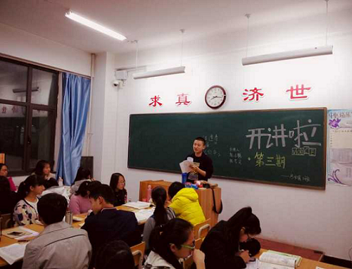 随后,陈艺文同学以听后回答对问题有奖励的形式开场,充分的调动了同学们的积极性,分别讲述了北京四大名医孙伯华(享年55岁,创办北平国医学院,擅长温热病学,喜用石膏),王逢春(享年70岁,擅长治疗时令病及肠胃病,对于温热病多发阐发,启迪后学。)着重讲述了施今墨,因为是其老乡贵州人。享年87岁,自学医术,20岁开始独立行医,对中医理论有很深的造诣。最后一位萧龙友,享年90岁,弃官行医,自学成才,成为一代名医大家。最后,陈艺文同学引出问题四位名医的平均年龄是多少?同学们争相计算。总之,以独特的方式让同学们对四大名医有了深刻的了解和认同。