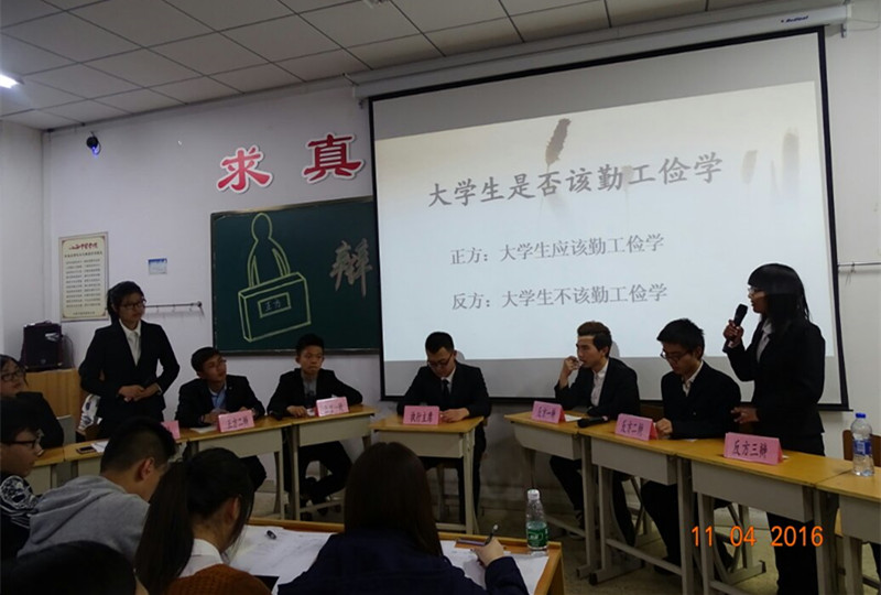 主持人王磊首先给我们介绍了此次比赛的规则与注意事项,共有六个小组参赛,两两对决,最后选出三个小组进入决赛。第一组的辩题是“大学生是否该勤工俭学”。刚开始,场上的氛围十分紧张,但观众却被反方的“因为我们长得美,所以我们说的都是对的”的话语,活跃了场上的氛围。正反方可谓针尖对麦芒,双方均据理力争、针锋相对,现场唇枪舌战,气氛一度达到高潮。最终正方以“实践是检验真理的唯一标准”微胜反方。