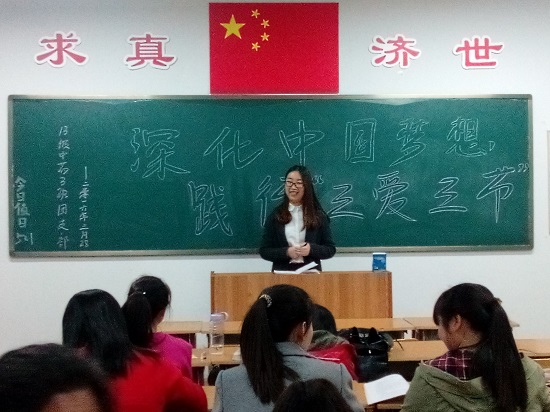 班会开始,主持人首先提出三个问题:第一,什么是“三爱”和什么是“三节”;第二,“三爱三节”是习主席什么时候提出来的;第三,举例说明对于我们怎样才能做到“三爱三节”。接下来,全班进行了“爱祖国”的知识抢答赛。最后,主持人的一个问题——今年考研的准确时间是多会儿,引起了大家激烈的讨论,其实时间还没公布,就是提醒考研的同学们要抓紧时间,不要再浪费这所剩不多的时光了,有梦就去拼搏吧,趁我们还年轻。