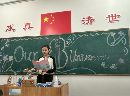 首先是由邓婕讲述“我的大学”。她以最近很热门的一部网剧“睡在我上铺的兄弟”来引发大家的共鸣。大学,一个有关理想,有关未来,有关奋斗的地方。这里有我们的兄弟,有我们拼搏的轨迹。她通过讲述关于大学生自立自强、拼搏奋斗的励志故事,使同学们深刻地认识到应该珍惜我们的大学生活,让自己的青春散发出迷人的光彩。