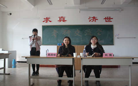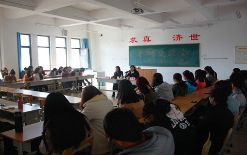 在班长对师姐们的简单介绍后,交流会切入正题。两位师姐针对前期搜集的考研问题,主要从院校选择、调剂问题、复习参考、考研意义四个方面为同学们做了详细的分析与指导。院校选择是考研的动力,刘捷师姐提醒同学们在选择院校时,应该综合考虑各方面的因素,不仅要分析考虑学校的排名,命题方式,分数线划定,导师方向,而且还要考虑到自身因素,力求全方位的搜集院校信息,最终选择适合自己的院校作为学习的动力。考研的重中之重是漫漫复习路,两位师姐通过分享自己的复习历程告诉同学们,复习要结合自己的具体情况,采用适合自己的复习方法,制订详细的复习计划,从而更高效率的复习。师姐还重点指出复习要有结构框架的复习,对于复习的理论还要活学活用,考研路漫漫,同学们还应劳逸结合,合理安排复习。在复习方法讨论结束后,师姐还对不同科目的复习为同学们分享了一些比较经典实用的复习参考书目,希望有助于考研复习。考研调剂问题是初试后面临的最头疼的问题,也是同学们最担心的问题,而“及时、礼貌的联系院校导师或同门师兄师姐”是葛国靖师姐亲身经历总结传授的妙招,多多与导师联系沟通,获取可靠信息可少走弯路,带来意外惊喜。考研是一项大工程,是一种人生规划,它最主要的意义在于选择考研是自我实现的需要。