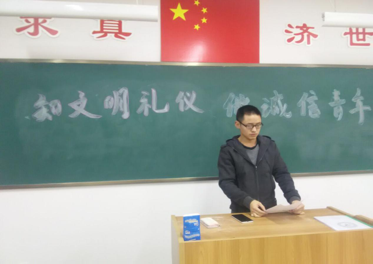 随着不诚信现象在大学生中日益凸显,比如考试作弊、论文抄袭、借书逾期不还、拖欠学费等屡见不鲜。严重影响了大学生的诚信问题。同时也正逢考试周的临近,我班于2015年12月27日晚7:30在管理楼106举办以“至文明礼仪,做诚信青年”为主题的团日活动。本次活动以讲座的形式开展,由宣传委员张腾月担任主持人,团支书刘立鑫主讲。