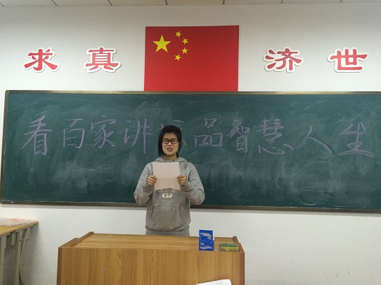 为使班上同学增长见识,增加涵养,吸取智慧,陶冶性情;锻炼学生的思辨能力与语言表达能力。我们班于12月25日早10时10分于和剂书院甲座312教室举办了“看百家讲坛,品智慧人生”的第一课班会。班会由班长王文欣主持。