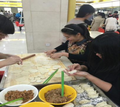 餐厅工作人员先给同学们做示范,接下来就是同学们大显身手的时候了。同学们围坐在一起,和面的和面,擀皮的擀皮,包饺子的包饺子,各组同学们齐心协力,八仙过海各显神通。虽然过程中出现奇怪的、各式各样的饺子,但那是每个人亲手创造的成果,展现了各个地方的不同的饺子样式。