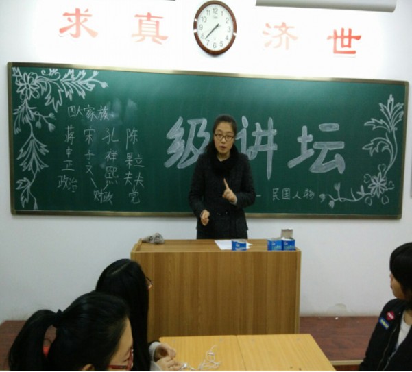 活动开始,文艺委员齐芳宣布此次讲坛的主题是“民国人物”。随后邀请杨靖、杨城、闫萌果三位同学依次上台演讲。三位同学分别对民国宋氏三姐妹、杨虎城、林徽因的人物生平、思想情感、突出贡献做了系统的介绍。同时,结合他们的时代背景进行分析,使这些历史人物的形象鲜活起来。期间,主持人请几位同学分享了他们的心得体会,交流彼此内心的感受。随后主持人齐芳请四位评委李紫薇、刘俊韩、栗颖以及许馨玥对三位主讲人的演讲做点评,四位评委对主讲人的发言进行了公平公正的点评。最后,主持人齐芳总结活动,并宣布此次班级讲坛圆满结束。