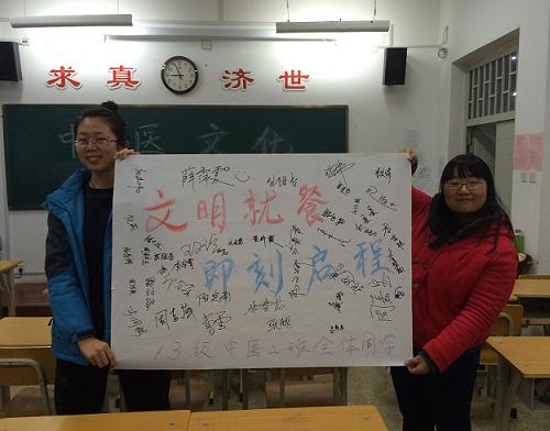 本次班会由团支书李香艳主持,班长协助。首先主持人展示了一组食堂不文明就餐行为的照片,例如剩菜剩饭、吃饭后不带走垃圾、就餐时大声喧哗吵闹、打饭插队无秩序等等,这些照片都是真实拍摄在学校食堂里面的,而这些不文明行为也真实的在我们身边上演。值得关注的是,同学们普遍反应,餐厅饭菜浪费现象表现最突出,大家给出的理由有饭菜不好吃、给的太多等等。正当大家抱怨食堂饭菜不合胃口时,主给出了一组照片,是摄影师拍摄于非洲的照片,照片中的人不论男女,甚至是正在哺乳的婴儿,无一例外都是瘦骨嶙峋,在那片广阔而又贫瘠的土地上,那里的人们却因饥饿生活在死亡的边缘。一组组触目惊心的数字令我们感到心酸和同情,与此同时同学们对于刚刚抱怨也开始有所思考。之后,班长向大家发起一个去餐厅做志愿者的活动,在收拾打扫的同时向广大学生们宣传文明就餐、勤俭节约的风尚,得到了同学们的热烈反响,先后有十多位同学举手愿意去当志愿者服务同学,其中预备党员、积极分子以及班委们都起到了良好带头作用。在班会尾声,大家一起在“文明就餐即刻启程”的宣传标语上签下了自己的姓名。