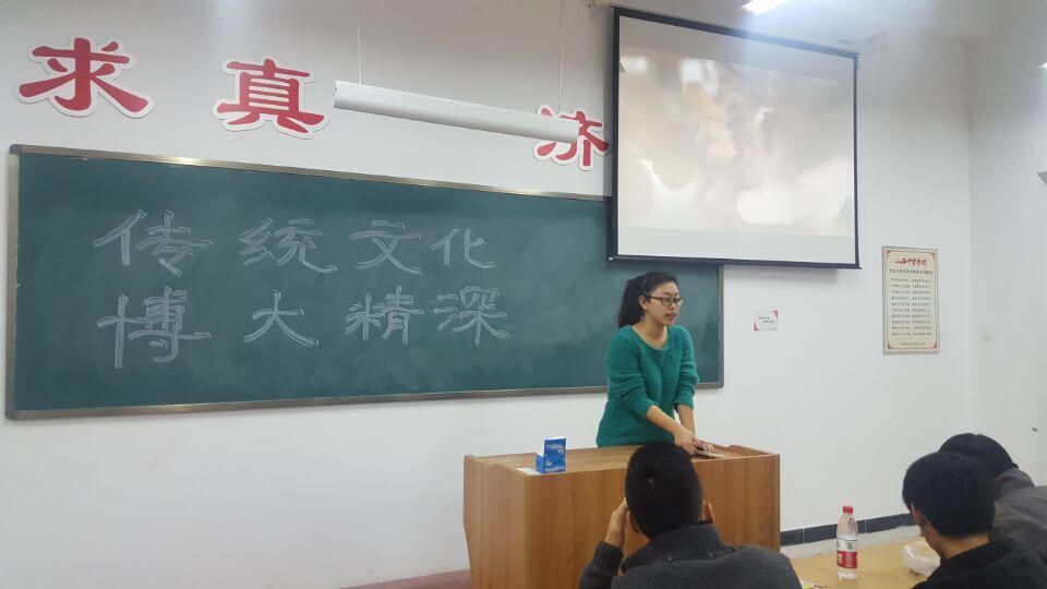 11月26日,15级市场营销一班开展了传统文化交流团日活动,徐佩馨主持并讲话。活动在知行书院117教室举办,15营销一班全体同学参加。