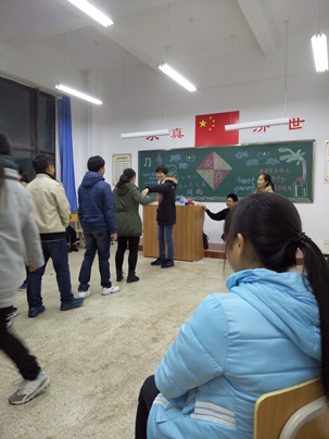活动分三部分进行,班长介绍本次活动主题和游戏规则。首先,借鉴快乐大本营的游戏方式,进行第一个“向左看,向右看”的游戏,本组人员依次站成一竖排,由其他组长指挥方向,在规定时间内成功最多的组有棒棒糖奖励,成绩最少的组要接受大冒险惩罚,积极带动同学们活跃气氛。随后开展第二项游戏,“你来比划我来猜”。本组人员举牌,做动作,不得说牌上的字和音,规定时间内完成最多的获胜,最少的依旧惩罚,本轮活动惩罚了辅导员婧姐,跳了脑白金的一段广告。最后进行的是“抢凳子”游戏,每组主动出两个人与其他组员PK,最后三轮的同学有奖励,前三轮淘汰的同学有惩罚。