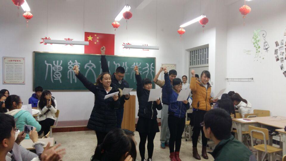 活动在团支书任杰的一番开场白之后展开。第一个活动是根据之前分好的小组进行“猜成语游戏”,经过两轮比拼后进行了惩罚,由贾谨娜和马楠演唱《独家记忆》。接下来是八个小组依次进行朗诵表演,其中刘紫薇组的《少年中国说》和张敏组的《鸿门宴》深得大家喜欢。第三个是成语接龙游戏,经过激烈的对决之后产生了前三名,分别是何晓权、周煜凤和成柳蓉,并对淘汰的五个小组成员进行了惩罚,其中表现最好的是王小英表演的手语《慢慢懂》和原雅敏、张梅、李晋蓉跳的健美操。最后,由任杰做总结发言本次活动结束。