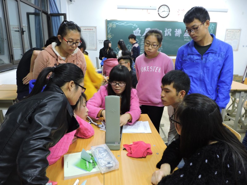 活动开始,贺婷介绍了一下本次讲座的主要内容,然后由郝丹丹为大家做详细介绍和操作。郝丹丹首先向大家介绍了血压的含义、作用、分类,以及血压计的构造。接着详细讲解了血压计的使用注意事项,如何正确测量血压,以及如何做好血压记录。贺婷就其说明进行了补充,并亲自示范如何正确使用血压计。然后,由青志团干事为各小组分发血压计,大家动手操作。同学们热情高涨,积极为小组同学测量血压并提出操作中的疑惑,干事们的耐心解答亲自示范进一步提高了同学们的学习热情。