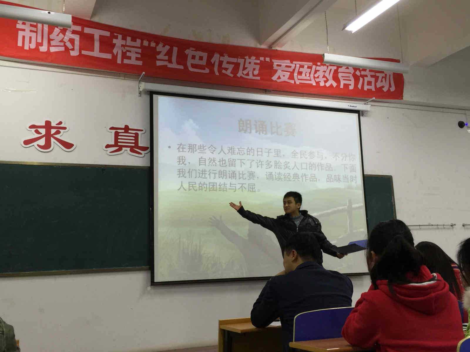 为纪念世界反法西斯战争暨中国抗日战争胜利70周年,2015年10月25日和27日晚七点,制药与食品工程学院制药工程专业1-4班全体同学,在医学楼323教室举办了“红色传递”爱国教育活动。