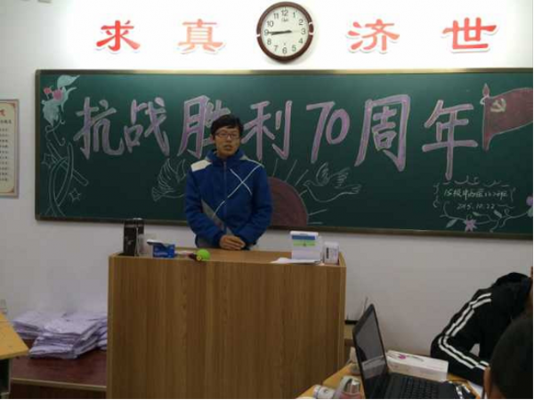 为纪念中国人民抗日战争暨世界反法西斯战争胜利70周年,传承伟大的抗战精神,弘扬我省光耀千秋的红色文化,深化社会主义核心价值观的培育践行,激发当代大学生的爱国主义情感,15级中西医2班团支部于10月22日晚在医学楼413教室开展“弘扬爱国主义精神,传承红色精神”为主题的团日活动并观看抗日大剧《血战午城》。