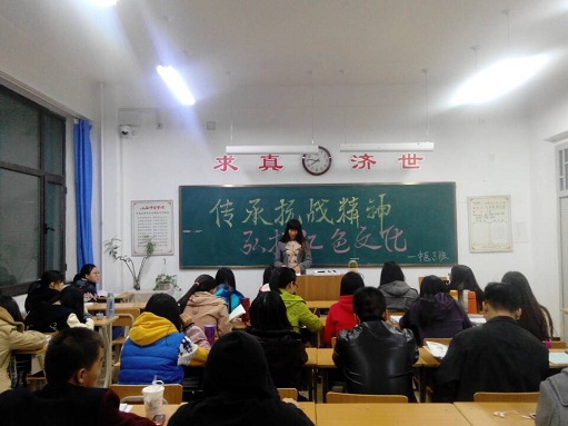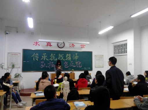 为弘扬抗战精神,纪念中国人民抗日战争暨世界反法西斯战争胜利70周年,10月22日晚7时许,13级中医3班于仁济书院316教室成功开展了以“传承抗战精神,弘扬红色文化”为主题的团日活动。此次活动由团支书丁翰怡主持。全班成员悉数参加。