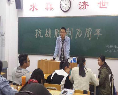 2015年9月28日,由山西中医学院中医临床分团委号召,12级中医2班第五团小组举办,12级中医2班全班同学参加的以“抗战胜利70周年”为主题的团日活动在医学楼308教室举行。