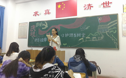 为了引导广大学生深刻认识党和国家的历史,增强大学生爱国之情,2015年9月24日晚8时,13级护理5班全体同学于新校区护理大楼406教室举行以“纪念抗日战争胜利70周年”为主题的团日活动。本次活动由团支书朱沂超主持。